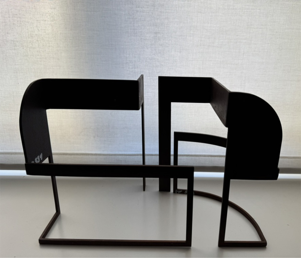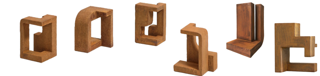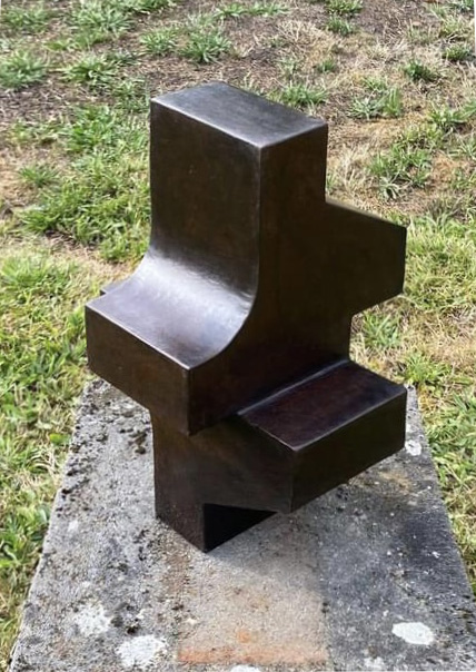 VERBROUWEN Helen, 627, acier Corten, 30x20x15,5cm ex. 4/5 2023 devant une photo de JOYE Nicole